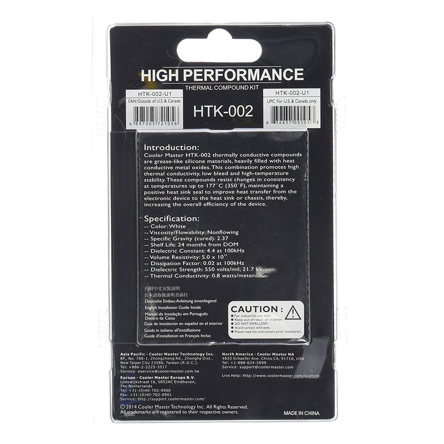 Los compuestos térmicamente conductores Cooler Master HTK-002 son materiales de silicona similares a las grasas, muy llenos de óxidos metálicos conductores de calor. Esta combinación promueve alta conductividad térmica, bajo sangrado y estabilidad a altas temperaturas. Estos compuestos resisten los cambios de consistencia a temperaturas de hasta 177 ° C (350 ° F), manteniendo un sellado positivo del disipador de calor para mejorar la transferencia de calor desde el dispositivo electrónico al disipador de calor o al chasis, lo que aumenta la eficiencia general del dispositivo.